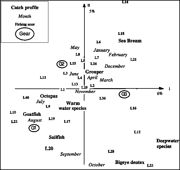 Figure 3 illustrates, as an example, the result obtained from a factorial analysis designed to study the relationship between some qualitative variables (Multiple Correspondence Analysis). Four qualitative variables are used to classify strategies in a multispecies fishery: 1 - the target (signified by the catch profile of the fishing vessels), 2 - the period, 3 - the gear, and 4 - the fishing grounds. The factorial technique makes it possible to visualize the proximities between the various modalities of the variables (8 targets, 12 months, 3 gears and 28 fishing grounds).