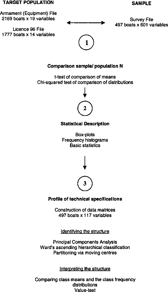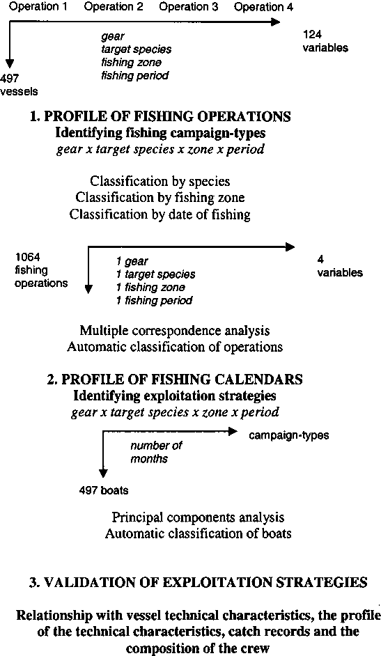 Producing a fishing fleet profile consists of exploring the structure of the data by analyses, on the one hand, of the relationships between the variables and, on the other hand, of the similarities between the individuals described by these variables. The first type of analysis allows the selection of the most relevant variables for the profile, and brings out the combinations of values of these variables which will best characterize the different classes of fishing unit. The second type of analysis makes these classes clear by grouping the individuals that resemble each other, on the basis of the description of the variables in the data tables. Two stages are recognized: