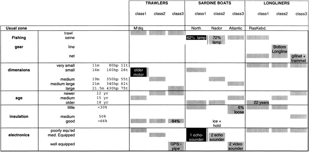 Figure 11: General presentation of the results of a typology of Moroccan coastal fleets according to technical characteristics (adapted from Taconet & Boumedien, 1998).