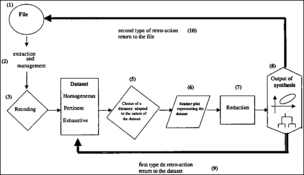 The general structure of the tree provides us with information on the heterogeneity of the data set and on the efficiency of the classification to define classes within it. The result depends on the classification algorithm used; that is why it is always necessary to specify which method has been used. It is not sufficient to say, for example, that an Ascending Hierarchical Clustering - AHC - has been used. In the example of the Moroccan coastal fleet profile, the method used for hierarchical classification is Ward's algorithm (a clustering technique based on variance). The result also depends on the size of the data-table being classified and therefore on the number of individuals and variables used. This last point is critical. In fact, if the number of individuals or the number of variables changes, you are likely to obtain slightly different results, especially if the structure of the data is "fuzzy". The more the elements of the profile are different, with distinct, valid classes, the more stable will be the results of the typological analysis. The main difficulty lies in constructing the data table to be analysed, in the choice of individuals and variables, and in the coding of the data. It may be necessary to remove "aberrant" individuals (and to then treat them as additional individuals), to avoid redundant variables, to cluster the modalities of nominal variables (to avoid including modalities for very weak frequencies). The first data-table can, if necessary (as is often the case), be modified, following the analysis of the relationships amongst variables and amongst individuals. This is why it is advisable as a first stage, to carry out a factorial analysis. This makes it possible to take account, in successive factorial analyses, of the sources of variability in the data set, and to identify the variables responsible for this heterogeneity and to locate the atypical individuals. This examination of the data-structure helps to plan the steps in the analysis. This is a useful first step, since it allows the data set to speak for itself and respond to successive adjustments. It is generally necessary, in the construction of the data-table, to refer back several times. Figure 7 illustrates these successive stages and the feedback that is often necessary in analysing the data set.