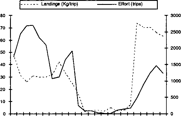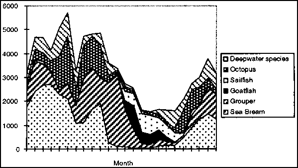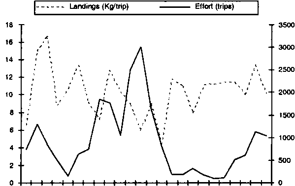 For each tactic, it is possible to locate and track catches of the various targeted species, to better understand the interaction between tactics in terms of the zones visited or the type of boats, and to study the evolution of yields. Illustrated below are two different tactics for the effort-yield relationship: liners catching sea-bream and liners catching grouper. The temporal evolution of the sea-bream liners is very uneven, and yield tracks effort; this fleet is made up primarily of migrant fishermen from the north. Grouper line-fishing shows an increase in effort at the height of the grouper migration period, with a cycle defined by the cool and warm seasons as for sea-bream, but the yield remains stable overall. An increase in the effort devoted to the "grouper" tactic corresponds to a reduction in effort devoted to the "sea-bream" tactic, and reflects a change in fishing tactics. |