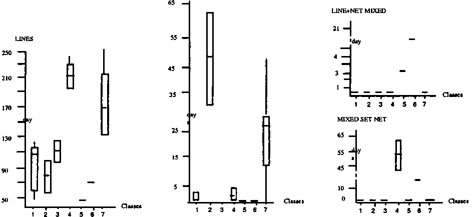 Analysis of captured species (1 064 operations × 73 species) The classification tree exhibits a very clear structure with 5 branches: 2 important classes are distinguished (I: 329 operations and V: 482 operations) corresponding respectively to 79% of the operations of the sardine boats and 89.8% of the trawlers (this latter class does not however consist entirely of trawler operations but includes 14% others): - class I (329 operations) corresponds to catches of pelagic species: sardine, anchovy, mackerel, scad; constituting 79 % of the sardine boat operations; - class II (115 operations) is characterized by captures of tuna and tuna-like species: skipjack, bluefin tuna, frigate tuna, bonito; constituting 47% of longliner operations, 46% of sardine boats and 6% of mixed-purpose boats (sardine boat-longliner); the use of drift gillnets particularly ... this class is unexpected and requires verification; - class III (96 operations, characterized by the swordfish and gillnets, is composed of 75.7 % of longliner operations and 10.2% of sardine boat-longliner; with the same comment as for the preceding class; - class IV (42 operations) is characterized by: scorpion fish, spiny lobster, pandora, sea bass, sea bream, grouper, Couch's sea bream, conger eel, John Dory, lobster, moray eel, composed 66.8% from operations of longliners using longlines and trammel nets; - finally class V (482 operations) corresponds to the demersal species: hake, sole, shrimp, octopus, mullet, cuttlefish, sea bream, John Dory, composed 89.8 % of trawlers. The raw data suggests an identification problem in classes II and III: concerning drift gillnets used by longliners. Verification by field experts is necessary but it could also be a coding problem. Finally, each fishing operation is characterized by a new qualitative variable of 5 modalities (number of the class of membership from 1 to 5) summarizing the type of species caught. Analysis of fishing zones visited (1 064 operations × 26 zones) A classification of the presence/absence of the 26 basic zones frequented shows that there are 7 principal geographical ranges exploited during the course of fishing operations: these results are illustrated in a graphic form as Figure 8. Two classes (II, III) correspond to operations taking place in the northern Atlantic, which covers the zone of the Straits; classes IV and V relate to operations in the western and eastern Mediterranean respectively, and classes VI and VII, of less significance, consist of groups of operations carried out in the southern and extreme southern Atlantic. Class I, the largest, includes within its group several "other operations" which correspond to a more restricted heterogeneity of range: Tan-tan/Laayoune, Agadir and/or Tangier. An automatic classification often gives a heteroclitic (anomalous) class which groups individuals which are different, but which do not fit into the other classes defined. Analysis of the fishing period (1 064 operations × 12 months) The classification tree leads to the definition of 4 very clear classes: The first semester of the year (January-June), the warm season from May to September, the cool period from October to March, and the second semester of the year (Figure 8). Analysis of bathymetric classes (1 064 operations × 6 depths) The same treatment is carried out on the depth-classes in order to define the bathymetric ranges fished during the course of operations. The classification tree reveals 8 classes (Figure 8): the first zone between 55 and 270 meters is more characteristic of the trawlers (64 percent, comprising 37 percent of the trawling operations), whereas the shallow depths (classes III, VII and VIII) are associated with the seine; classes IV, V and VI, characterized by higher bathymetry, and correspond more to the north Atlantic zone and the Mediterranean, associated with the trammel net, gillnet and pelagic longline (Annex V). It is important to note that for the depth-classes with a strong relationship to a particular gear-type, this variable will not be used in profiling operations; it will be only needed in the analysis as a supplementary variable. |