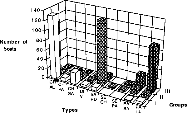 The result of profiling fleet exploitation strategies is illustrated by the example of the Moroccan coastal fleet (see Figure 6). It may be recalled that the goal is to obtain a classification of the 497 boats for a representative sample of the fleet, according to the exploitation strategies implicit in their fishing operations (see Annex I and Annex III for the "fleet operations" heading of the questionnaire and the list of coded variables). The term "fishing operation" (or campaign) is used to label the ensemble of place, gear, time and target of fishing. A difference in one of these criteria (example, a different fishing zone) requires the coding of a new fishing operation, and each boat could carry out several fishing operations during the year prior to the investigation.