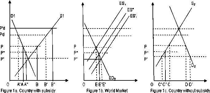 Figure 1: Graphical illustration of the effects of cotton subsidies in a two-region world trade model
