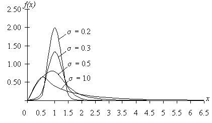 Dans ce cas, em est un paramètre d’échelle et s un paramètre de forme. La forme d’une distribution log-normale est hautement flexible, comme le montre la Figure 2.5 où sont tracées les courbes d’équations (2.29) pour différentes valeurs de s et pour m = 0.