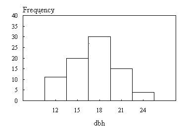 Si les valeurs des dbh sont enregistrées au centimètre le plus proche, la classe d’intervalle 11-13 comprend théoriquement toutes les mesures allant de 10,5 à 13,5 cm. Ces nombres sont les extrémités, ou limites réelles, des classes; le plus petit nombre (10,5) est l’extrémité inférieure de la classe et le plus grand (13.5) l’extrémité supérieure de la classe. Dans la pratique, les limites réelles des classes s’obtiennent en ajoutant la limite supérieure d’un intervalle de classe à la limite inférieure de l’intervalle de classe suivant plus élevé, et en divisant par deux.