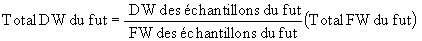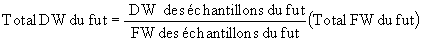 Dans le commerce du bois, la mesure utilisée est généralement le volume, mais certains produits comme le bois de feu ou le bois de trituration se vendent aussi au poids. Le poids est aussi la mesure standard pour de nombreux produits forestiers mineurs. En recherche, on se réfère de plus en plus souvent à la biomasse. Il est certes plus facile de déterminer le poids plutôt que le volume, mais divers problèmes, comme le caractère variable de la teneur en humidité et de l’épaisseur de l’écorce, font que cette mesure n’est pas fiable. On exprime donc en général la biomasse en poids sec des parties de l’arbre (tronc, branches, et feuilles). On utilise des méthodes destructrices pour déterminer la biomasse d’arbres individuels, en les abattant et en séparant les parties, comme le tronc, les branches, les rameaux et les feuilles. Il importe de bien définir toutes les parties constituantes de l’arbre: par exemple, tout matériel issu du tronc, dont la circonférence mesurée sur écorce est inférieure à 10 cm, fait partie du bois des branches. Les différentes parties doivent être pesées immédiatement après l’abattage. Si l’on veut obtenir des poids séchés à l’étuve, les échantillons sont prélevés à ce stade. Au moins trois échantillons d’environ 1 kilo doivent être prélevés sur le tronc, les branches et les rameaux de chaque arbre ; ensuite il faut les peser et les emporter au laboratoire pour le séchage à l’étuve. Le poids sec total de chaque partie constituante de l’arbre est ensuite estimé en appliquant le rapport poids frais / poids sec observé dans l’échantillon, au poids frais total correspondant des parties constituantes de l’arbre. Par exemple,