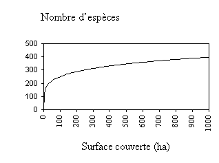 L’augmentation du nombre d’espèces en fonction du nombre d’individus ou de la surface couverte est représentée par une courbe d’accumulation des espèces. La relation entre le nombre d’espèces (S) et la surface couverte (A) est souvent donnée mathématiquement par l’équation S = a Ab , dont on trouvera ci-dessous la représentation graphique pour des valeurs spécifiques de a et b (a = 100 et b = 0.2). Ici , les paramètres a et b devront être estimés empiriquement à l’aide des techniques de régression linéaire avec des données sur la surface couverte et le nombre d’espèces enregistré correspondant.