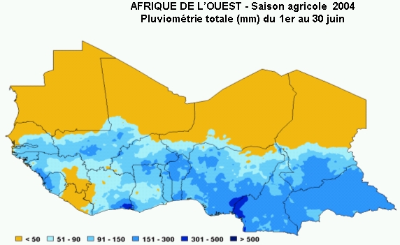 La première carte indique les quantités totales de pluies du 1er au 30 juin. Les données sont extraites de rapports de terrain de la FAO et de l'imagerie satellitaire d'estimation des pluies (RainFall Estimate - RFE) produite par le projet NOAA/USGS/FEWS/USAID. Les images RFE sont obtenues par interpolation de divers paramètres enregistrés au sol et de ceux obtenus grâce à des mesures de télédétection telles que : précipitations, humidité relative, vitesse du vent, altitude, températures des nuages froids.