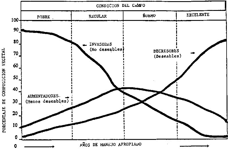 En la figura 11 se da un ejemplo de retrogresión. Los animales comen, en primer término, las especies que más les agradan, las que por lo general son las más nutritivas y productivas y las mejores conservadoras del suelo y del agua. Consecuentemente, estas especies disminuyen con el sobre-pastoreo continuado y se las llama "disminuidoras" o "deseables".