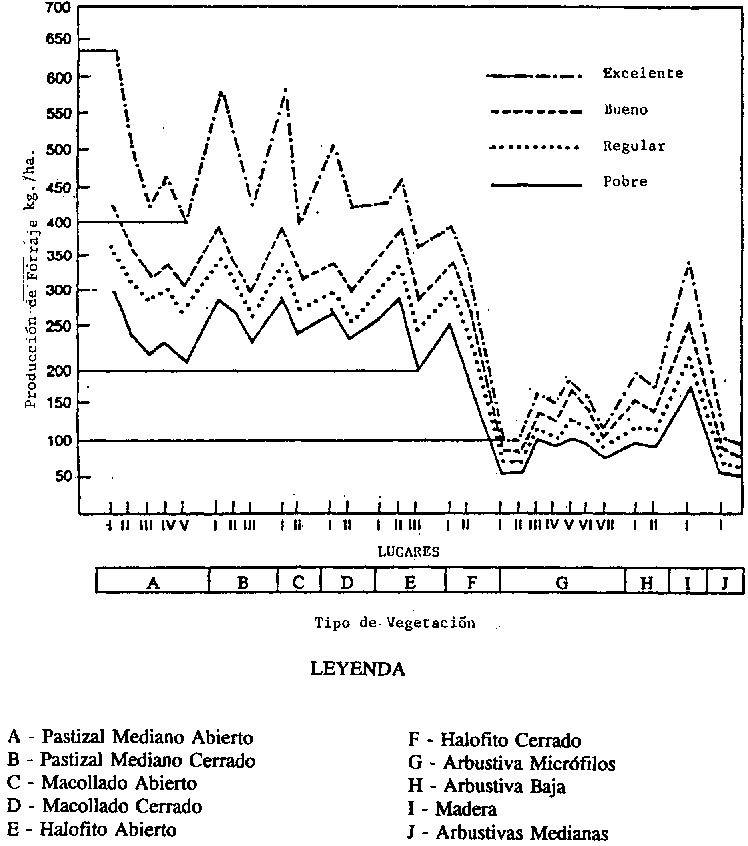 González (1966) informó sobre relaciones similares 7 para los diversos tipos de tierras de pastoreo en el estado de Chihuahua, México. Estas se encuentran ilustradas en la figura 14. Había diferencias considerables en la producción de forraje, entre los tipos de vegetación, sin considerar la condición. El potencial para las halófilas y las tierras arbustivas es muy bajo en comparación con las tierras de pastoreo. La condición excelente, en los diversos tipos de tierras de pastoreo, produjo mucho más forraje que las otras clases de condición, lo que hace que el logro de la condición excelente sea una meta valiosa. Se observó una variación considerable en la producción debida a los sitios.