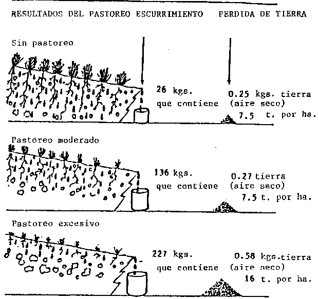 Sin embargo, concluyeron que el escurrimiento era mayor con tasas de ocupación moderadas en comparación con pastizales ociosos, pero que no existían diferencias en cuanto a la erosión, como lo ilustra la figura 15. El pastoreo excesivo produce escurrimiento y erosión excesiva (figura 15.) Estos y otros datos indican que se puede sustentar la producción animal sin causar daños al ambiente en lo que respecta a erosión. Esto ha sido corroborado por varios estudios.