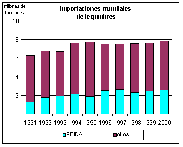 Las importaciones de legumbres de los PBIDA se estiman en alrededor de 2,5 millones de toneladas, lo que representa más del 30 por ciento de las importaciones mundiales de legumbres. Entre 1990 y 1999, las importaciones totales de legumbres de dicho grupo de países crecieron un 6 por ciento anual, debido a la lentitud del crecimiento de la producción interna en relación con la demanda. El frijol seco era la