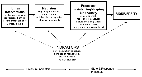 Criteria and indicators are at times developed within a conceptual framework which recognizes pressure, state, and response indicators. In a complementary process to the present one, aimed at identifying criteria and indicators of biodiversity conservation, Stork et al. (1997) showed the equivalence of pressure-state-response indicators to different components of a system involving human interventions, mediating processes, processes that conserve biological diversity, and the response of biological diversity itself (Figure 1). Brown et al. (1997) pointed out that pressure, state, and process (equivalent to response) indicators have different information contents. For example, assessing verifiers of the mating process is potentially very valuable, but it is also rather difficult and expensive. Verifiers of population size may be used as surrogates of mating, but its information content is less. Conversely, individual genetic variation provides more information on the actual response to mating, but the effects of other developmental processes are confounded in verifiers of individual variation. Therefore, the choice of appropriate indicators and verifiers is always going to be a trade-off between information content, scale of monitoring, and costs.