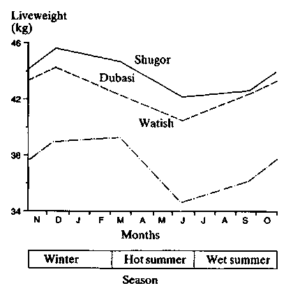 In the present study, the mean weight at first conception of the Shugor, Dubasi and Watish ewe lambs was 35.1 kg (Table 3). The subtype of the ewe and the season and year in which she first conceived had significant influences on this weight: in addition there were significant differences in weight of ewes which subsequently gave birth to singles or twins. Differences between years are, however, confounded with seasonal variations and the specific managements and rearing procedures followed in different years.