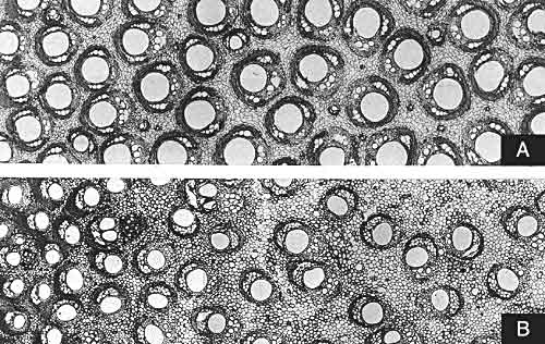 La structure du rotin permet de faire la distinction entre les espèces adaptées à une utilisation industrielle (par exemple, une espèce de Calamus - voir A) et les espèces moins prometteuses (par exemple, une espèce de Plectocomia - voir B)