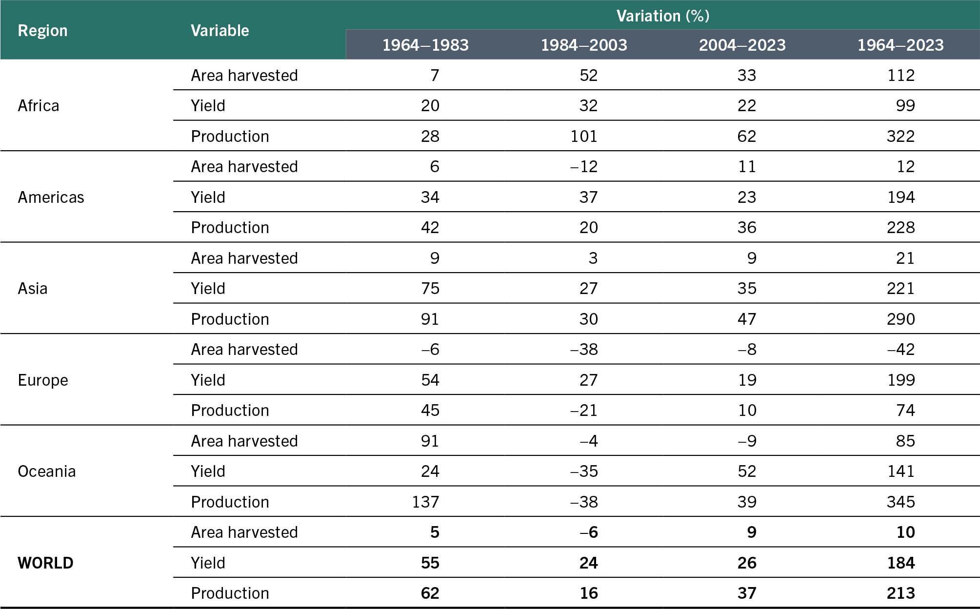 Cropping intensity is another source of production increase. The ratio of harvested area to arable land gives an indication of the cropping intensity for a given period. Table 2 shows that globally there was an increase of 26 percent in cropping intensity in the period 1964–2023. Increases in Africa and the Americas were the highest, while in Asia the increases were low, and negative in the case of Europe.