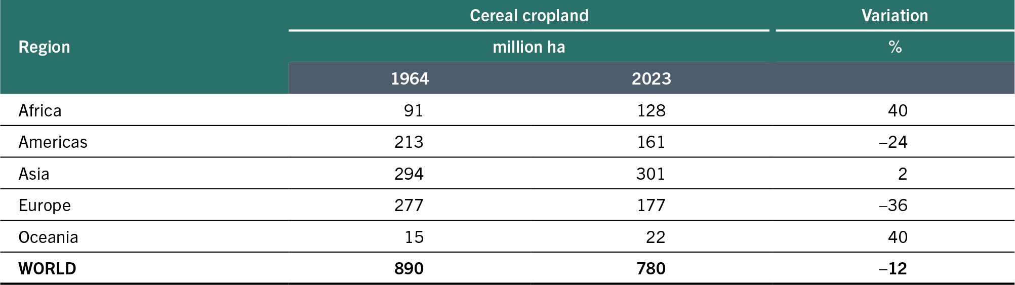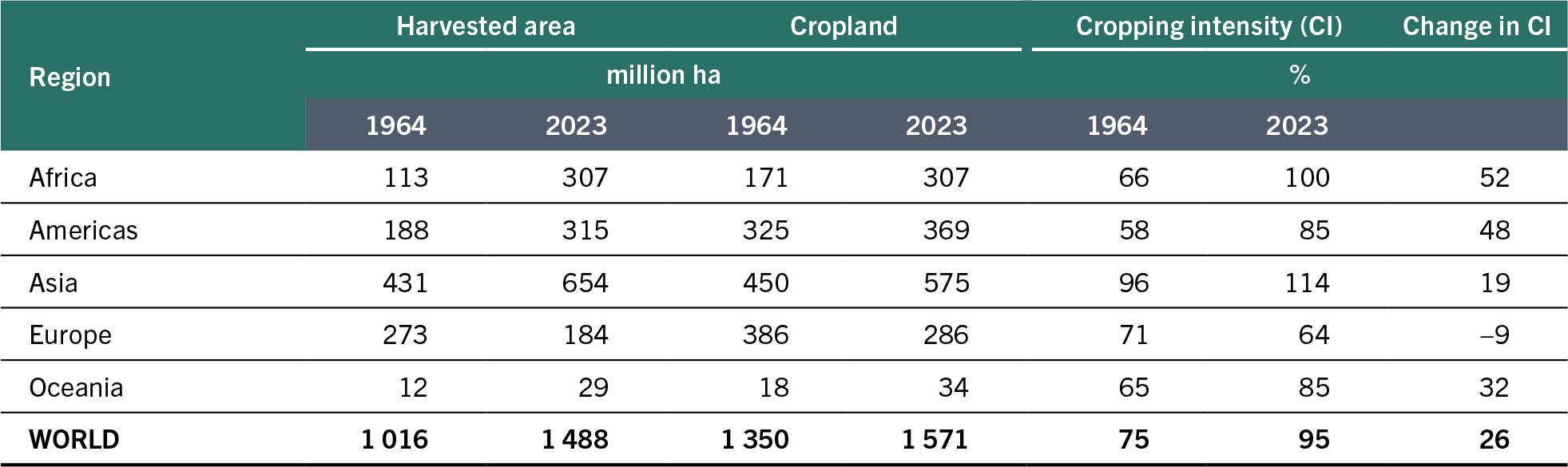 Data on cropping intensities per crop are not available at country level. Based on Table 2, and assuming the same cropping intensity for cereals, Table 3 provides an estimate of the change in extent of cereal cropland over the period 1964–2023.