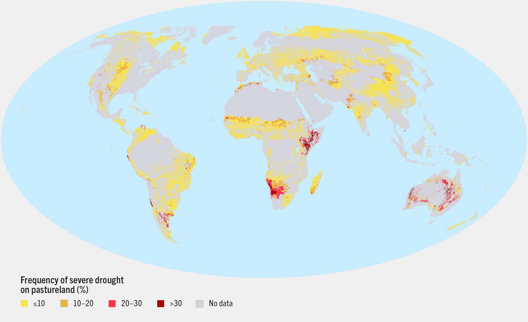 In the past 40 years, on a global scale, droughts have impacted people more than any other natural disaster. About 128 Mha (11 percent) of rainfed cropland (see Figure 9) and 656 Mha (14 percent) of pastureland (see Figure 10) frequently experience droughts (FAO, 2020). The intensity, duration, frequency and spatial extent of droughts are expected to increase due to climate change and rising temperatures. This will translate into an even greater burden on farmers if land degradation is not halted and reversed. Reports to the UNCCD from more than 100 countries revealed that 1.84 billion people were affected by droughts in the 2022–2023 biennium (UNCCD, 2023).