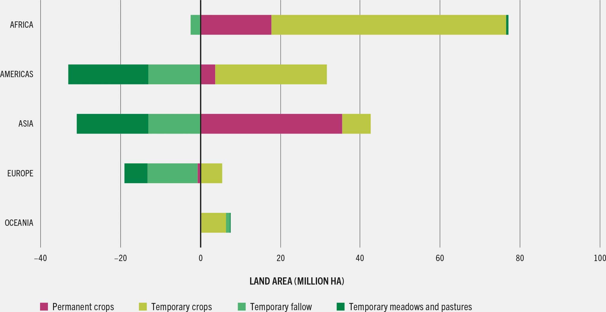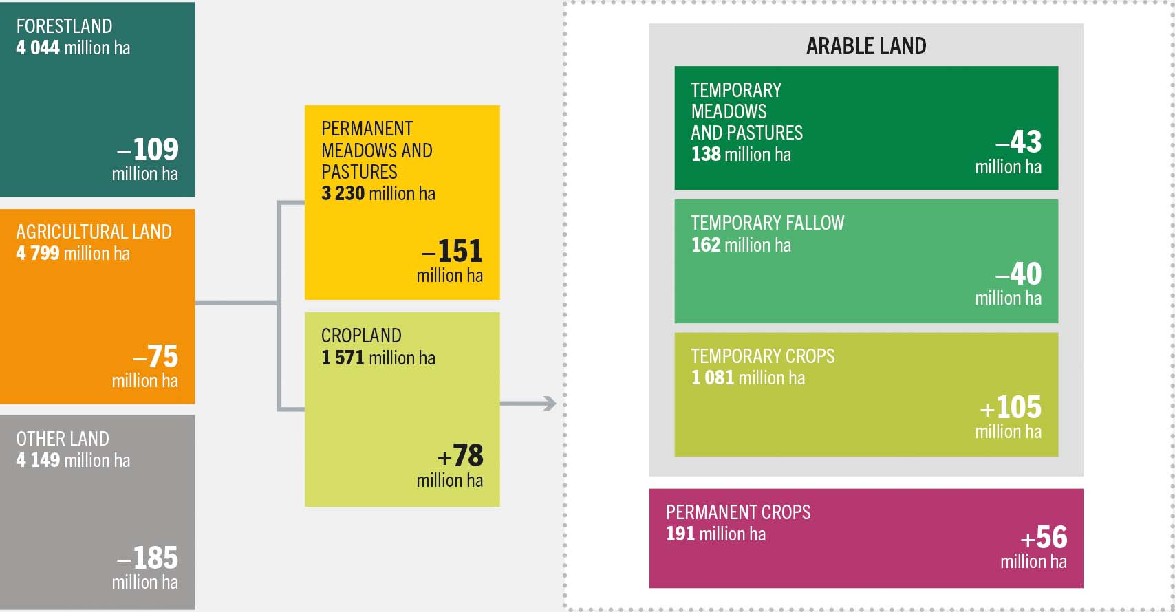 According to FAO land-use definitions, cropland is further divided into arable land and permanent crops, which accounted for 1 381 and 191 Mha, respectively, in 2023. Arable land is land used for the cultivation of temporary crops – crops with an annual cycle – such as wheat and maize, in rotation with fallow land and temporary pastures in management cycles of up to five years. The interplay of these components over time determines the patterns of land-use change (see Figure 7).