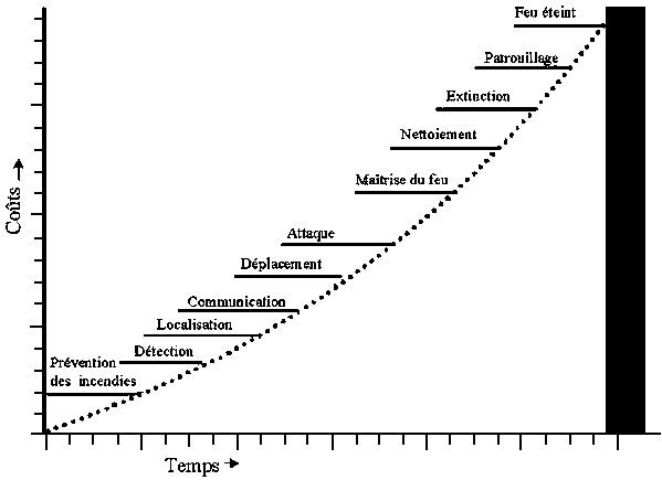 8. L'adoption du principe de base que "chaque minute compte". Tous les éléments du programme de protection sont conçus pour réduire le plus possible le temps nécessaire à empêcher la propagation du feu. Au fur et à mesure que le feu se propage, les dommages et les coûts augmentent et les facultés des individus à éteindre le feu diminuent (figure 1).