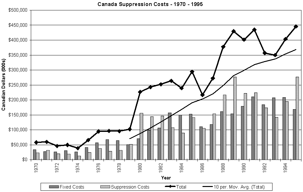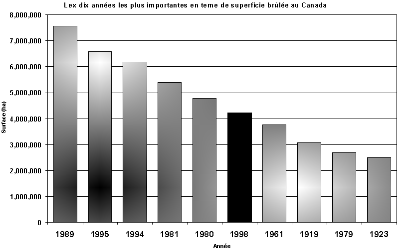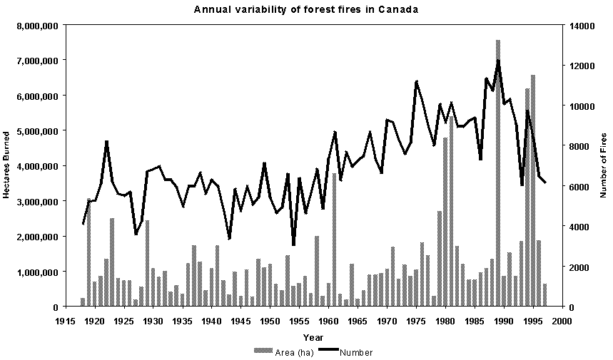 Les données concernant la superficie brûlée au niveau national au Canada remontent seulement à 1918. Avant 1930, les statistiques annuelles des incendies étaient notées de manière quelque peu aléatoire (Ramsey et Higgins 1991). Des incohérences existent aussi dans la mesure où les territoires du Yukon et du Nord-ouest (qui renferment de vastes zones forestières) n'ont signalé les superficies brûlées que depuis 1946, et les provinces de Terre-Neuve et de l'Ile-du-Prince-Edouard depuis 1947 et 1971 respectivement (Van Wagner 1988). En outre, avant 1980 certains organismes ne signalaient que les incendies pour lesquels des actions d'extinction étaient entreprises.