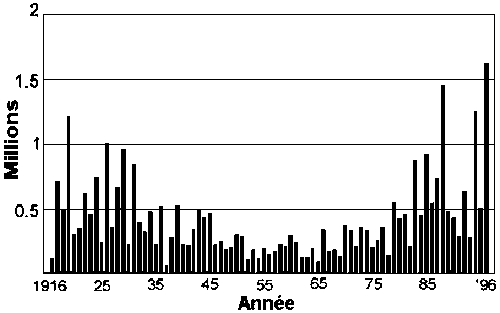 · les engagements internationaux (inventaires mondiaux de la biomasse brûlée, bilan du carbone, conventions sur la biodiversité);Le nombre des incendies et les superficies brûlées chaque année peuvent varier considérablement (figure 2). Tous les incendies ne sont pas complètement éteints au Canada, certains recevant une intervention modulée. Huit pour cent des incendies de 1995 ont reçu une intervention modulée mais ils représentaient 60 pour cent de la superficie brûlée. En moyenne, 10 000 incendies brûlent 3 millions d'ha par an (figure 3), dont environ 750 000 ha de forêts commerciales (une superficie égale aux 3/4 de la superficie exploitée annuellement).· les intérêts nationaux (critères et indicateurs, gestion forestière durable, stratégie forestière nationale, santé et sécurité publiques, biodiversité, émissions atmosphériques);