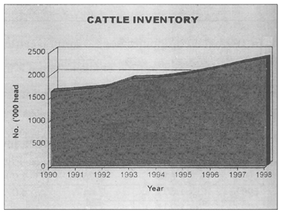 The cattle population showed an increasing trend during the period 1990–1998. From 1.6 million head in 1990, it slowly increased to about 2.3 million in 1997. Between 1993 and 1997, the average yearly growth was 4.2 percent.