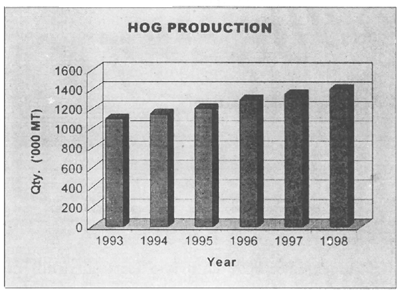 Pig. After 1997, pig inventory shrank abruptly from 8 040 000 to 3 770 000 head. Growth of production slowed down from 6.87 percent in 1996 to 3.59 percent in 1998.
