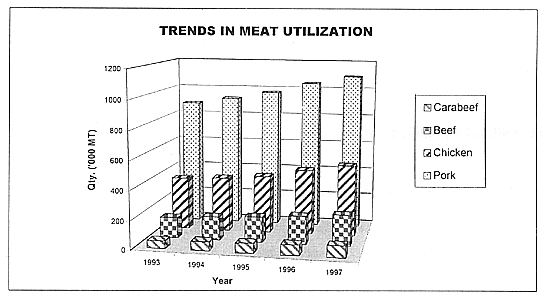 Except for pork, all types of meat and milk, whether locally produced or imported, are consumed locally. The local consumption of meat and milk increased during the 1993–1997 period along with the population. ‘Carabeef’ led the way with yearly increases of about 14 percent, followed by beef, 12.4 percent, as significant imports of both made them available and cheap at the market. Chicken and pork consumption also increased, by 9 and 6 percent respectively. The percentage share of beef and ‘carabeef’ increased from 13.5 in 1993 to 15.6 in 1997. A minimal increment was also observed for chicken but pork lost out, its share shrinking from 61.14 percent in 1993 to 58 percent in 1997.
