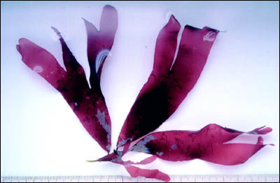 Dulse, Palmaria palmata. The smallest division on the scale is 1 mm,