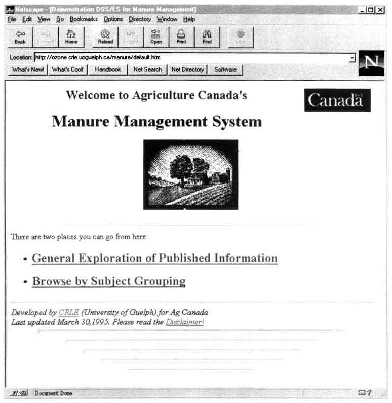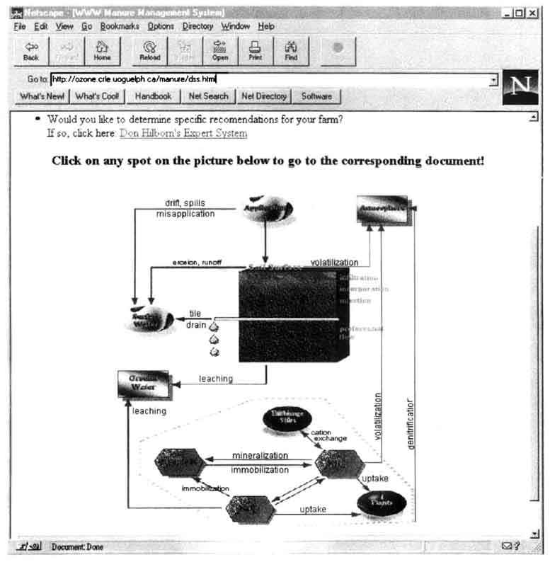 a) Manure Wizard: La gestión del estiércol en las explotaciones está condicionada en gran parte por los problemas que representa su repercusión en la calidad del agua. Dicha gestión es, con frecuencia, compleja, ya que supone decisiones sobre la química del estiércol, tipos de animales, predicción cuantitativa, aspectos económicos de la manipulación del estiércol, diferentes posibilidades de eliminación, aplicación en diferentes condiciones de suelos, pendientes y tipos de cultivos, etc. Como la gestión del estiércol puede tener importantes efectos contaminantes e implicar cuantiosos gastos de contención y eliminación en las explotaciones, Manure Wizard ofrece al agricultor toda la información necesaria para decidir con conocimiento de causa sobre las posibilidades que se le ofrecen. Este programa, elaborado en la Universidad de Guelph (Canadá) para Agriculture Canada, permite al agricultor interrogar al sistema de información sobre cualquier aspecto de la gestión del estiércol en las diferentes condiciones agrícolas que se pueden dar en Ontario. El sistema contiene textos explicativos, y además permite al usuario conectarse, a través de Internet, con otras mentes de información documental. Contiene una "base de conocimientos" que ayuda al agricultor a buscar una solución acertada y eficaz en función de los costos. La base de conocimientos está integrada por las opiniones autorizadas de profesionales de este sector, que se integran en la base de datos y luego se aplican al problema concreto del usuario. Este programa, una vez elaborado, ofrece al agricultor información completa y sistemática para la toma de decisiones, y no requiere dominio del uso de ordenadores por parte del usuario.