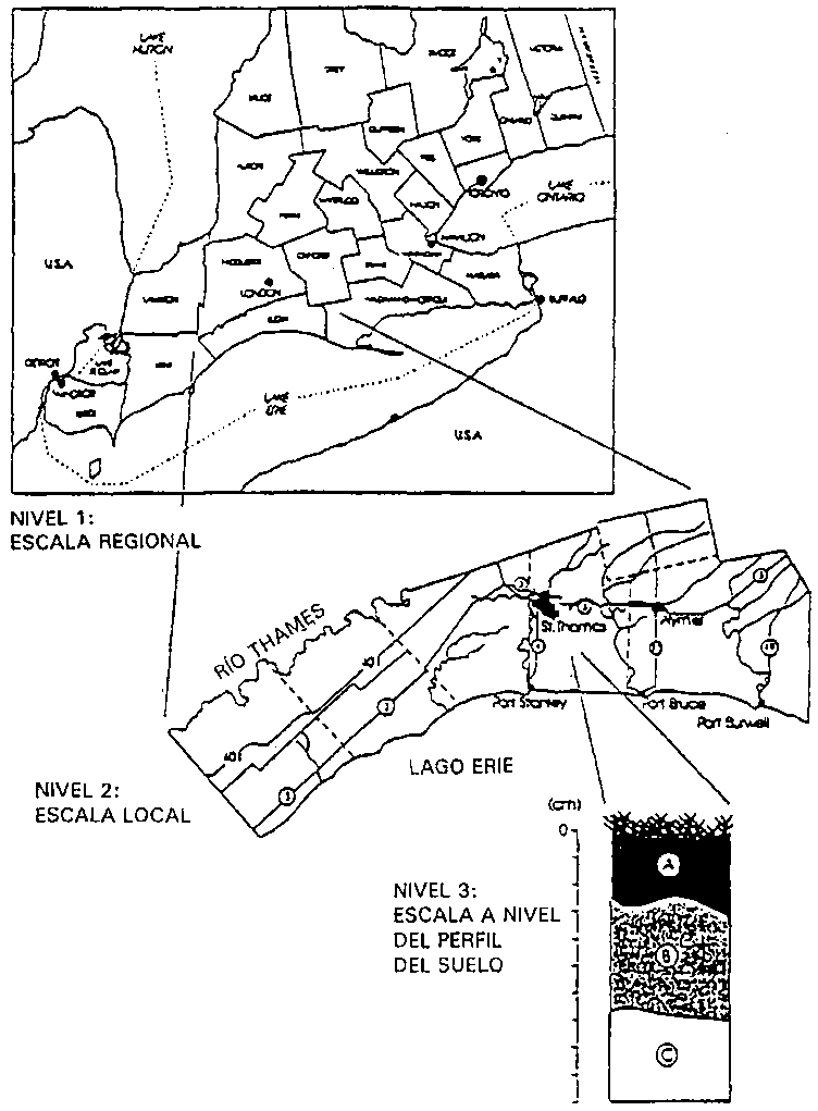 EXPRES se ha ampliado hasta convertirse en un medio de evaluación regional (Figura 15), gracias a la labor de Crowe y Booty (1995), con tres escalas diferentes de aplicación - perfil de los suelos, local y regional. El análisis más detallado es el del perfil de los suelos, mientras que las escalas de mayor amplitud se utilizan como instrumento de diagnóstico previo para determinar las posibilidades relativas de contaminación de las aguas subterráneas y la necesidad de supervisión de las mismas.