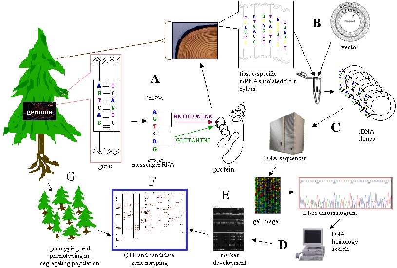 Despite remarkable progress much work remains to be done to understand the nature of genetic variation that underlies adaptive forest tree phenotypes. Comprehensive understanding will first require discovering, annotating and cataloging all genes in the forest tree genome. One approach towards achieving this goal is to determine the DNA sequence of the entire genome and infer the genes from the DNA sequence. This approach is currently not feasible in all forest trees because of their large genome size, but Populus - with a relatively small genome size - can serve as a model species. An alternative (or parallel) approach is to determine the DNA sequences for the gene-coding regions only. This can be accomplished by isolating mRNA, preparing cDNA libraries from this mRNA and sequencing cDNA. These EST sequences are submitted to databases and compared to all other sequences in the databases to see if they match to genes whose function has been determined. EST databases of tens of thousands of ESTs have been already produced and are publicly available for Pinus, Picea, Populus, and Eucalyptus.