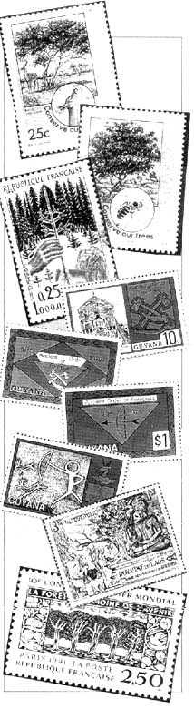 La concepción del bosque como un ecosistema y no como una simple colección de árboles, se ha reflejado en la imagen de numerosos timbres postales que, en vez de presentar un solo ejemplar, reproducen alguna combinación de especies de la fauna y de la flora. Los primeros sellos que adoptaron este punto de vista- los precursores - son la edición de 1903 de Madagascar, que reproduce el «árbol de los viajeros» (Ravenala madagascariensis) bajo el cual se refugia un cebú (Bos indicus) y la serie de 13 sellos emitida por Australia en 1937 con un koala (Phascolarctus genus) abrazado a una rama de eucalipto.