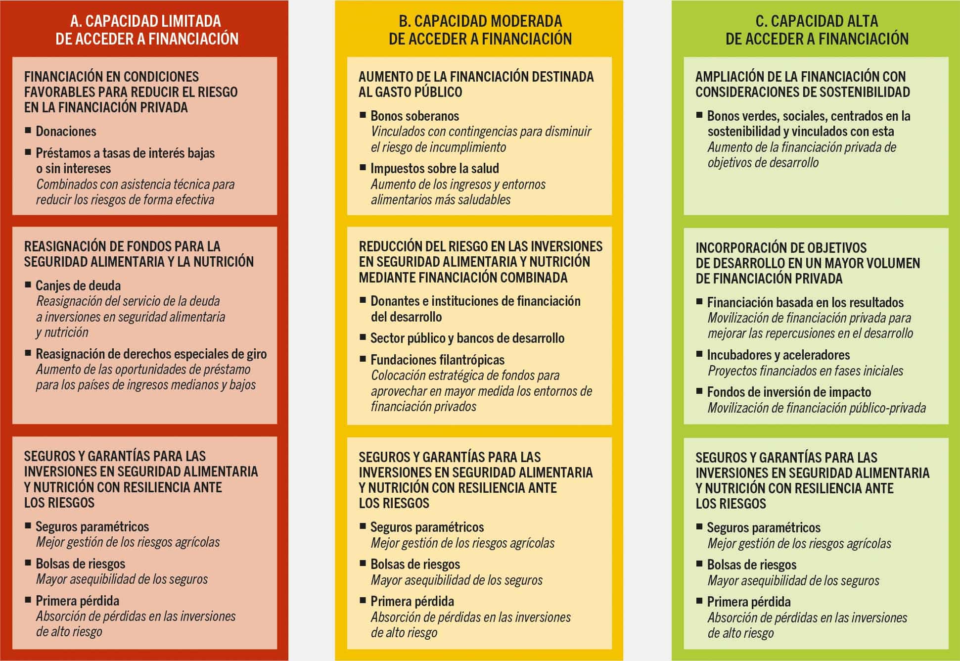 Las innovaciones, en particular las que crean mercados,32, ofrecen una base económica sólida, ya que brindan a la población general acceso a un producto o servicio que anteriormente no era asequible o alcanzable o simplemente no existía. En el caso de la financiación, la innovación moviliza, aprovecha y reorienta los recursos para aumentar la eficacia y la eficiencia de los flujos financieros encauzándolos a fines específicos,33 como la seguridad alimentaria y la nutrición, a los que de otro modo no se dirigirían ni destinarían. No obstante, aunque todos los instrumentos y mecanismos se encuentran a disposición de los países —en función de su perfil de riesgo y, por lo tanto, del costo del capital—, los países que presentan niveles elevados de riesgo financiero no pueden acceder con facilidad a opciones de financiación óptimas para lograr la seguridad alimentaria y mejorar la nutrición.