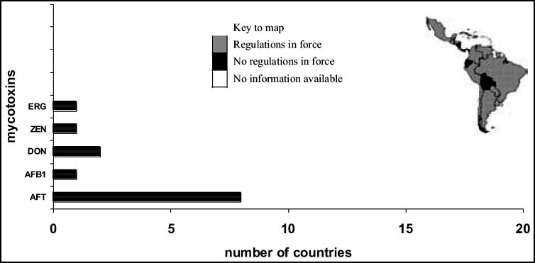 The major Latin American agricultural crops (maize, wheat, coffee, cotton, soybeans, barley, sunflower, groundnuts and tree nuts, cocoa and dairy products) are highly susceptible to fungal contamination and mycotoxin production (Pineiro, 2004). Figures 9 and 10 show the occurrences of regulatory limits for various mycotoxins in Latin America in food and feed respectively. Nineteen countries, accounting for 91 percent of the population of the region, were known to have specific mycotoxin regulations. Harmonized regulations for aflatoxins exist in MERCOSUR, a trading block consisting of Argentina, Brazil, Paraguay and Uruguay (see also Section 3.5.3). Incidentally other countries indicate that they follow MERCOSUR regulations. The aflatoxin regulations in food are often set for the sum of the aflatoxins B1, B2, G1 and G2. Uruguay has the most detailed regulations, including limits for ergot alkaloids in feeds, which is rather unique in the mycotoxin regulatory world.