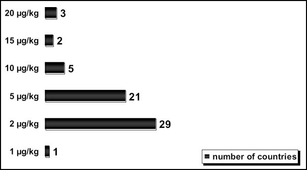 Since 1995 many more countries have regulated patulin, mostly in fruit products such as apple juice. The vast majority of countries with regulations or guideline levels for patulin in food have set these at the same level (50 mg/kg) as illustrated in Figure 19. Harmonized EU limits for patulin have recently come into force for various products (European Commission, 2003a). This makes patulin one of the most regulated mycotoxins in the world.