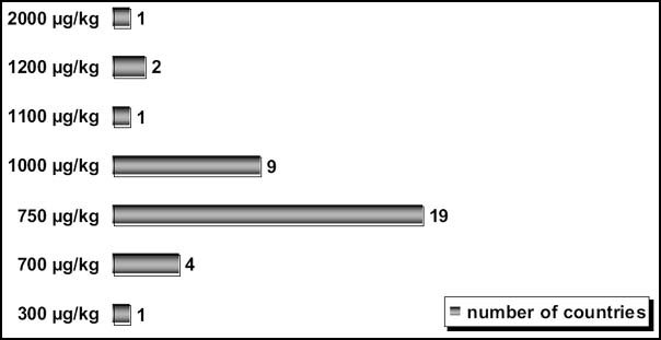 Zearalenone, an estrogenic mycotoxin, is now regulated in food in 16 countries (see Figure 22) compared to six countries in 1995. Zearalenone is structurally related to a-zearalanol (zeranol), an anabolic growth promoter banned in the EU in 1988. Zearalenone is metabolized in cattle to various compounds including zeranol. By regulating the zearalenone contents of animal feed, the problem of the occurrence of natural zeranol in edible tissues could be controlled. Limits for zearalenone in maize and other cereals currently vary from 50 to 1 000 mg/kg. Figure 22 betrays a tendency of setting limits at higher rather than at lower limits.