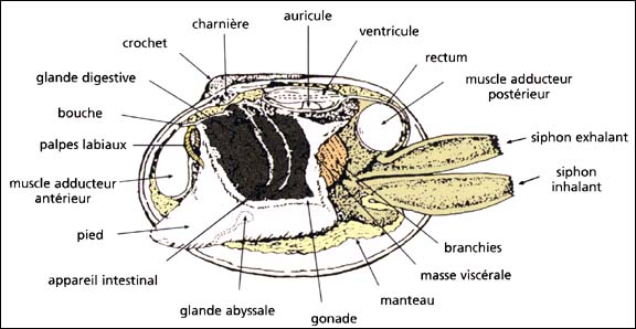 Les bivalves appartiennent au phylum des mollusques. Ce dernier est constitué d'animaux divers comme les chitons ou polyplacophores (plusieurs plaques), les gastéropodes, les dentales, les céphalopodes (calamars, poulpe, etc.), ainsi que les palourdes, huîtres et pectinidés. Ce phylum contient six classes, dont celle des Lamellibranches ou des Bivalves. Ces animaux sont comprimés latéralement et les parties molles de leurs corps sont partiellement ou intégralement couvertes par la coquille. Celle-ci est composée de deux valves liées par une charnière. Les branchies (dites aussi cténidies) de ces bivalves sont des organes bien développés, assurant une double fonction: l'alimentation et la respiration.