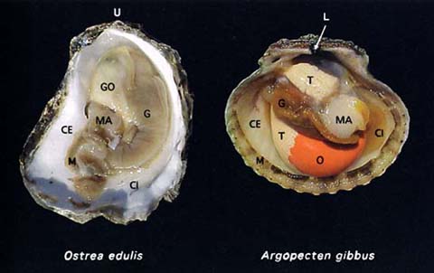Figure 8: Anatomie du corps mou de l'huître plate européenne, Ostrea edulis, et du pétoncle calico, Argopecten gibbus, visible après l'enlèvement de l'une des deux valves. Clé: MA - muscle adducteur; B - branchies; GO - gonades (différentiées comme O - ovaire et T - testicule dans le pétoncle calico); L - ligament; M - manteau et U - umbo ou crochet. Les chambres inhalantes et exhalantes de la cavité du manteau ont été identifiées comme CI et CE respectivement.