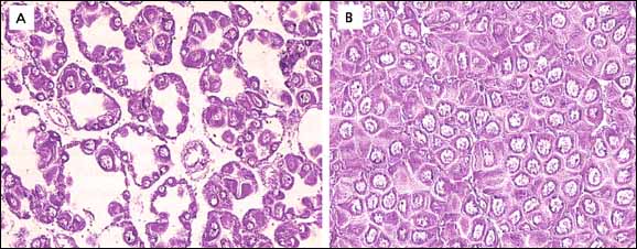 Figure 10: Microphotographies de coupes histologiques de l'ovaire du pétoncle, Argopecten gibbus, durant la gamétogenèse. A gauche (A), des ufs en développement peuvent être vus sur les parois de nombreux follicules. La photo de droite (B) montre des follicules remplis d'ufs matures (avec l'aimable autorisation de Cyr Couturier et Samia Sarkis).