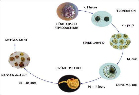 Le temps consacré à la phase embryonnaire et au développement larvaire est propre à chaque espèce et dépend de la température (figure 11). En vingt quatre heures l'oeuf fécondé a passé le stade multicellulaire appelé blastula et le stade gastrula et vingt quatre heures et trente six heures plus tard, elle se transforme en trochopore mobile. Les trochopores présentent une forme plus ou moins ovale, une taille d'environ 60-80 mm et possèdent une rangée de cils en position équatoriale et sont dotés d'un long flagellum apical qui leur permette de nager.