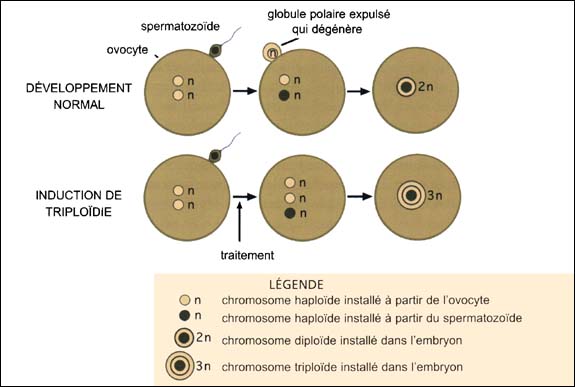 Les triploïdes sont produits en empêchant les ovocytes d'achever leur méiose et restent donc à l'état diploïde (2n). Quand un tel ovocyte est fécondé par du sperme au stade 1n (haploïde), il en résulte un triploïde (figure 109).