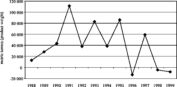 Regarding fish trade with foreign countries, the five countries, considered as a group, had, in 1999, a negative trade balance in the fishery sector, equal to -8 000 t (Figure 2, based on Table A1.11). However, Figure 2 shows that the negative fishery trade balance (in quantity terms) is only a feature of the most recent years of the series, with the exception of 1997.