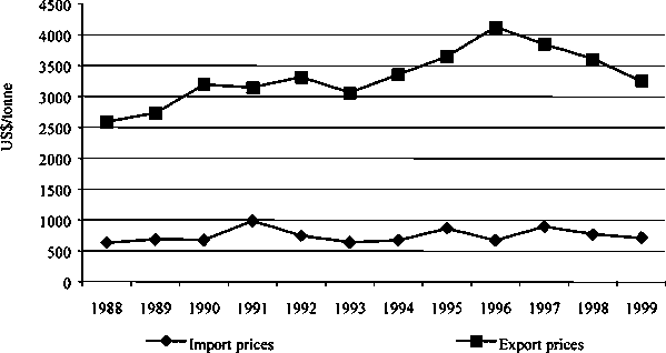 Figure 4. Export and import prices per tonne of fish products of North African Mediterranean countries, 1988-1999.