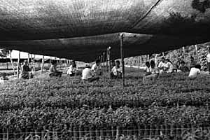 Travailleurs entretenant de futurs arbres dans une pépinière d'Eucalyptus au Honduras; dans la Région Amérique latine et Caraïbes, les plantations d'Eucalyptus seront parmi les principales sources de matière première ligneuse en 2050
