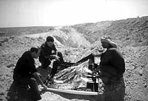 À l'avenir, les dunes de sable du Proche-Orient pourraient être transformées en sanctuaires de faune et en parcs d'agrément; sur la photo, techniciens consultant une carte satellite sur l'évolution d'une réserve de faune dans l'oasis de Palmyre, en République arabe syrienne
