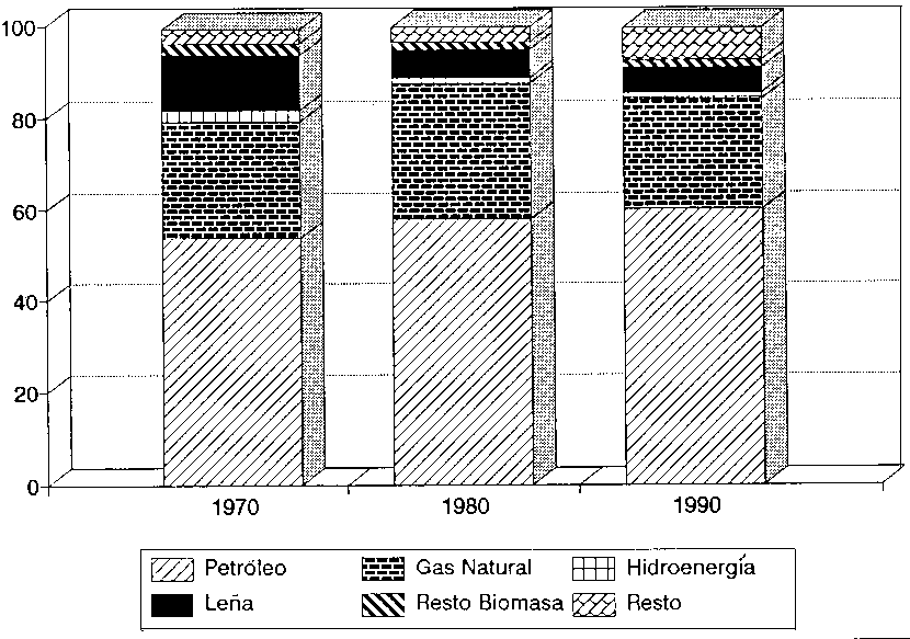 A nivel de Fuente, entre los años extremos citados, se observa la incorporación de la Geotermia y la Nuclear, pero en conjunto constituyeron en 1990 sólo el 0,52 por ciento de la OTEP.