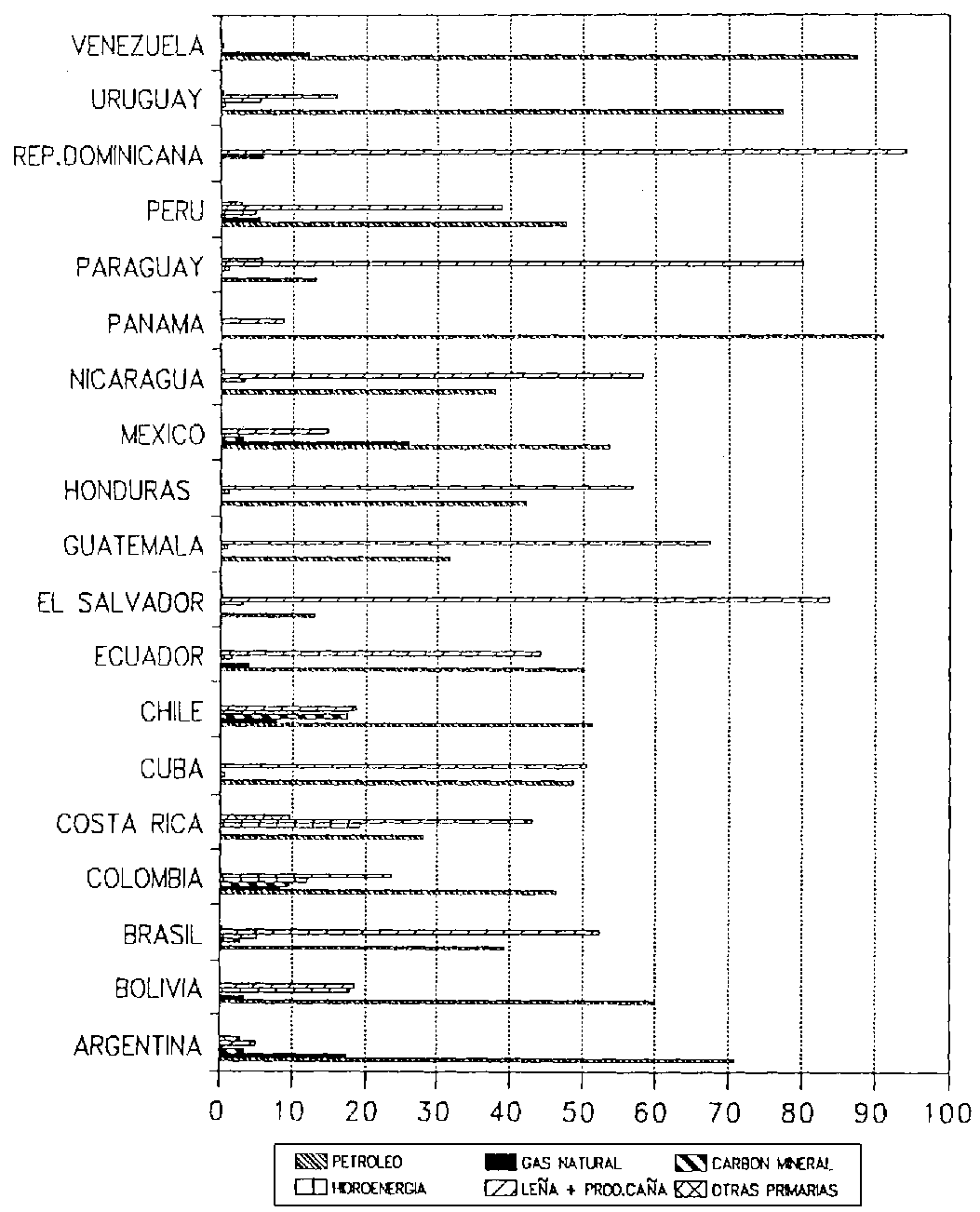 En 1990, la participación relativa de la LEÑA en la OTEP superó niveles del 40 por ciento en El Salvador (país que enfrenta una crítica situación de escasez de LEÑA), Guatemala, Honduras y Nicaragua, aproximándose al mismo la oferta en Costa Rica (39,2 por ciento de la OTEP); Brasil, Paraguay, Perú y la Rep. Dominicana muestran participaciones superiores al 20 por ciento pero inferiores al 35 por ciento; en Bolivia, Colombia, Chile, Ecuador, Panamá y Uruguay la participación de la LEÑA en las respectivas OTEP se encuentra por encima del 10 por ciento y debajo del 20 por ciento, siendo, como ya se dijo, de escasa significación la participación de esta fuente en las OTEP de Argentina (1,47 por ciento), Cuba (2,1 por ciento), México (5,5 por ciento) y Venezuela (0,0 por ciento), aunque cabe reiterar que en estos países, excepto Cuba, la información de consumos de LEÑA y otros Bioenergéticos se encuentra subestimada.